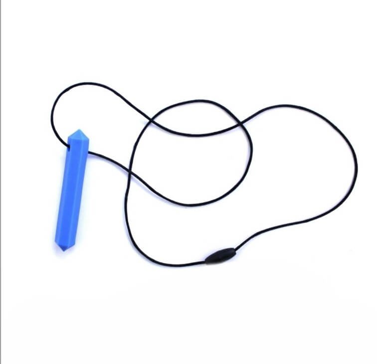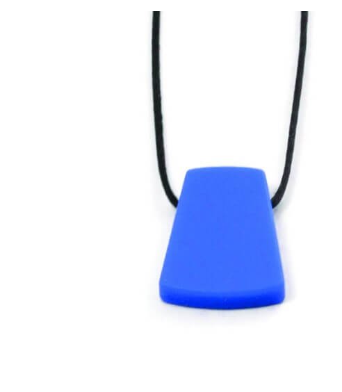 Een blauwe Geo bijtketting. Deze siliconen bijtketting is een vrolijke en veilige ketting waar op gekauwt of gesabbelt kan worden. Dit ter vervanging van bijvoorbeeld op t-shirts, haren of pennen zuigen of bijten. Het helpt bij concentreren of te kalmeren.