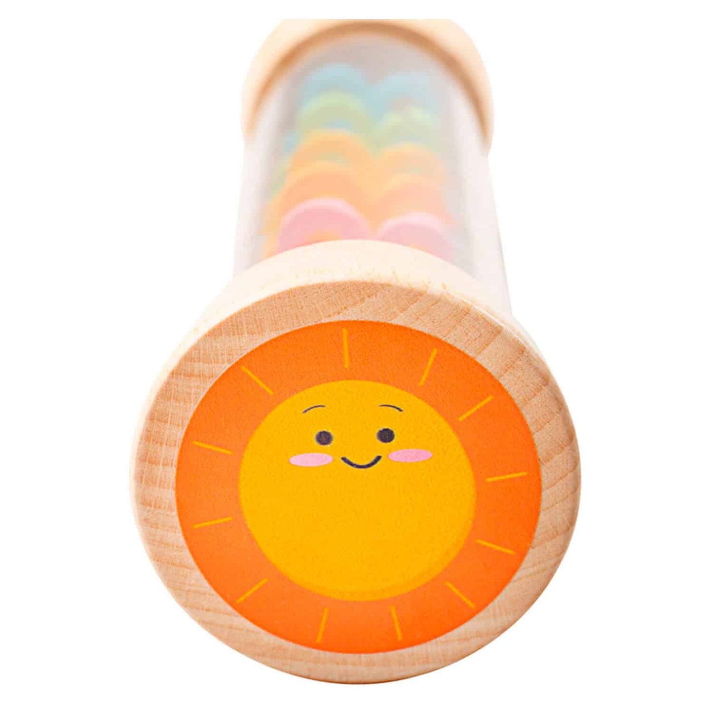 Draai de regenmaker ondersteboven en het geluid van de balletjes doen je denken aan het zachte geluid van regendruppels. Met deze regenmaker kunnen zachte regentonen worden nagebootst. Veelzijdig als rammelaar, ritme-instrument, klankspeelgoed of rustgevend zintuiglijk spel. Bekijk hoe de gekleurde kralen zich door de zes gekleurde bloemvormige platen druppelen. Zo worden akoestiek en visuele waarneming getraind. Een houten regenmaker waarin je uren kunt turen naar de vallende balletjes.