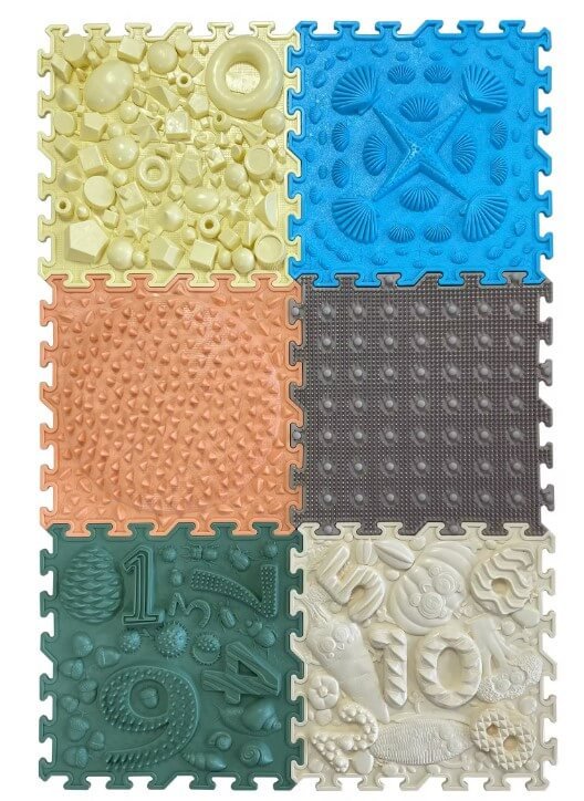 In onze webshop kun je kiezen uit pakketten met sensorische tegels bestaande uit 6, 8, 10, 16 of 19 stuks. Elke set is met elkaar te combineren door ze aan elkaar te puzzelen. Deze set bestaat uit 6 verschillende delen.De kleuren van elke individuele mat kunnen variëren. elke set is afzonderlijk opgemaakt en de kleuren kunnen afwijken.
