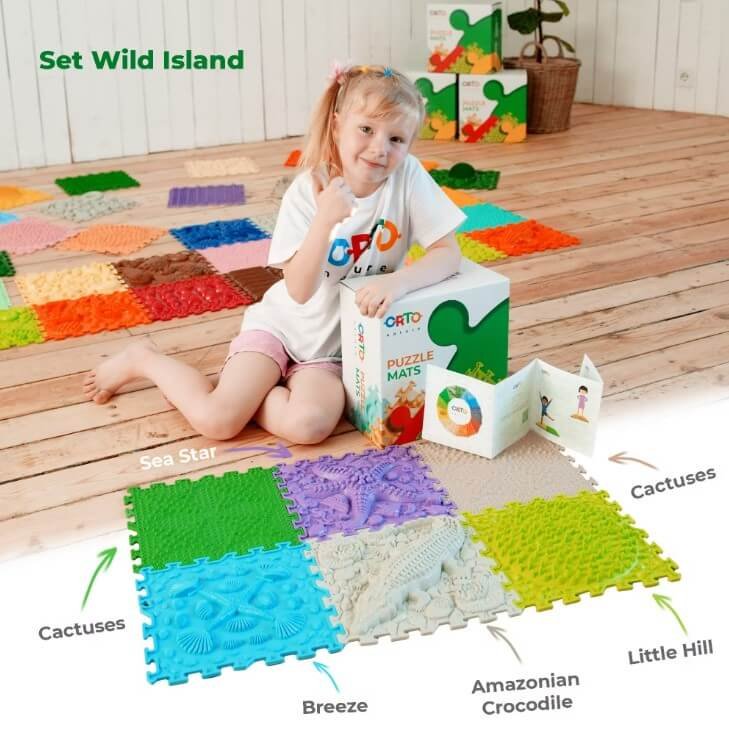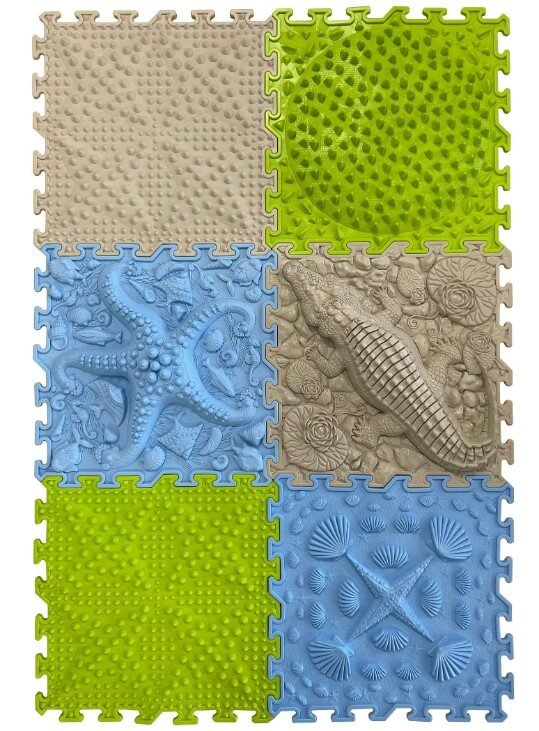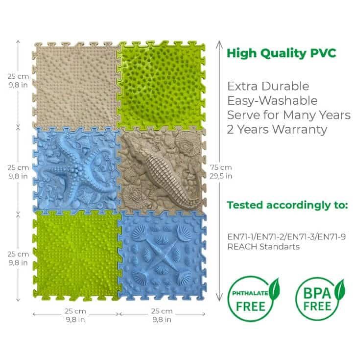 De puzzelstukken zijn gemaakt van hoogwaardig PVC (polyvinylchloride) BPA- en ftalaatvrij, dat duurzaam, gemakkelijk wasbaar en jarenlang meegaat. Een breed scala aan mattentexturen en kleuren stimuleert de verbeelding, verbetert de bloedcirculatie, bevordert de correctie van platvoeten, helpt oedemen in de benen te verwijderen en ontwikkelt het vestibulaire systeem.