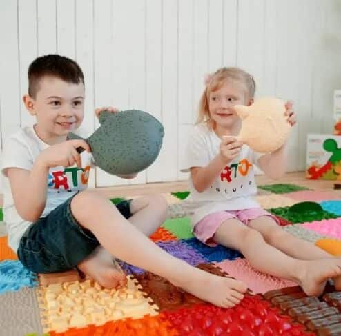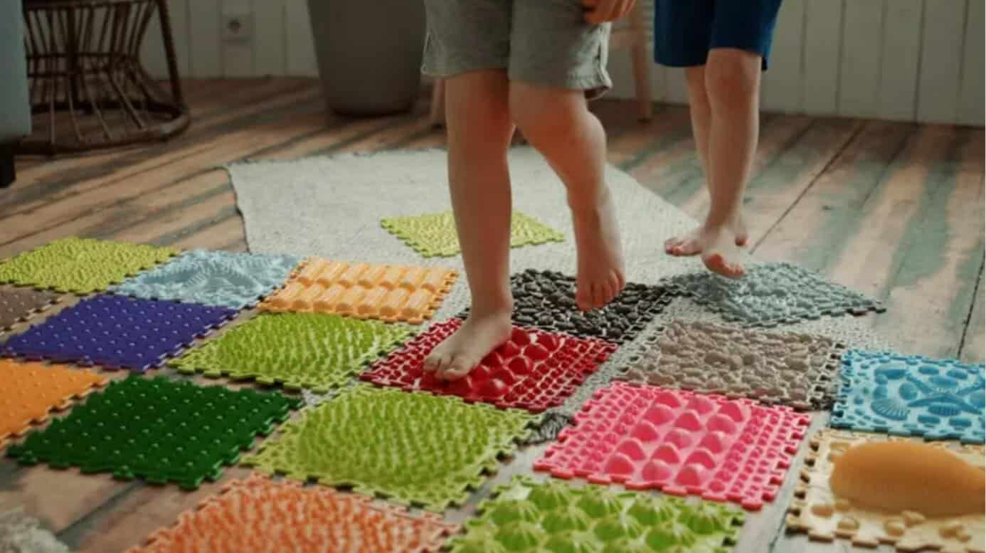 Veel kinderen vinden het heerlijk om over de tegels heen te lopen en de verschillende structuren onder hun voeten te voelen. Dit is heel goed voor de motorische ontwikkeling en het evenwicht. Sommigen schrijven het lopen over de matten ook een therapeutische werking toe vanwege de drukpunten in de voet die verbinding hebben met andere delen in het lijf die hiermee gestimuleerd worden. Het wisselen van ondergrond helpt daarnaast ook bij platvoeten. Naast erover lopen, vinden veel kinderen het fijn om de matten met hun handen te ontdekken. De matten zijn geweldig voor gebruik in scholen en kinderdagverblijven en kunnen worden gebruikt om interactieve of zintuiglijke verhalen te creëren en om fantasierijk spel, kleurverkenning en gezamenlijk spel te bevorderen.Sensorische matten in verschillende hoeveelheden