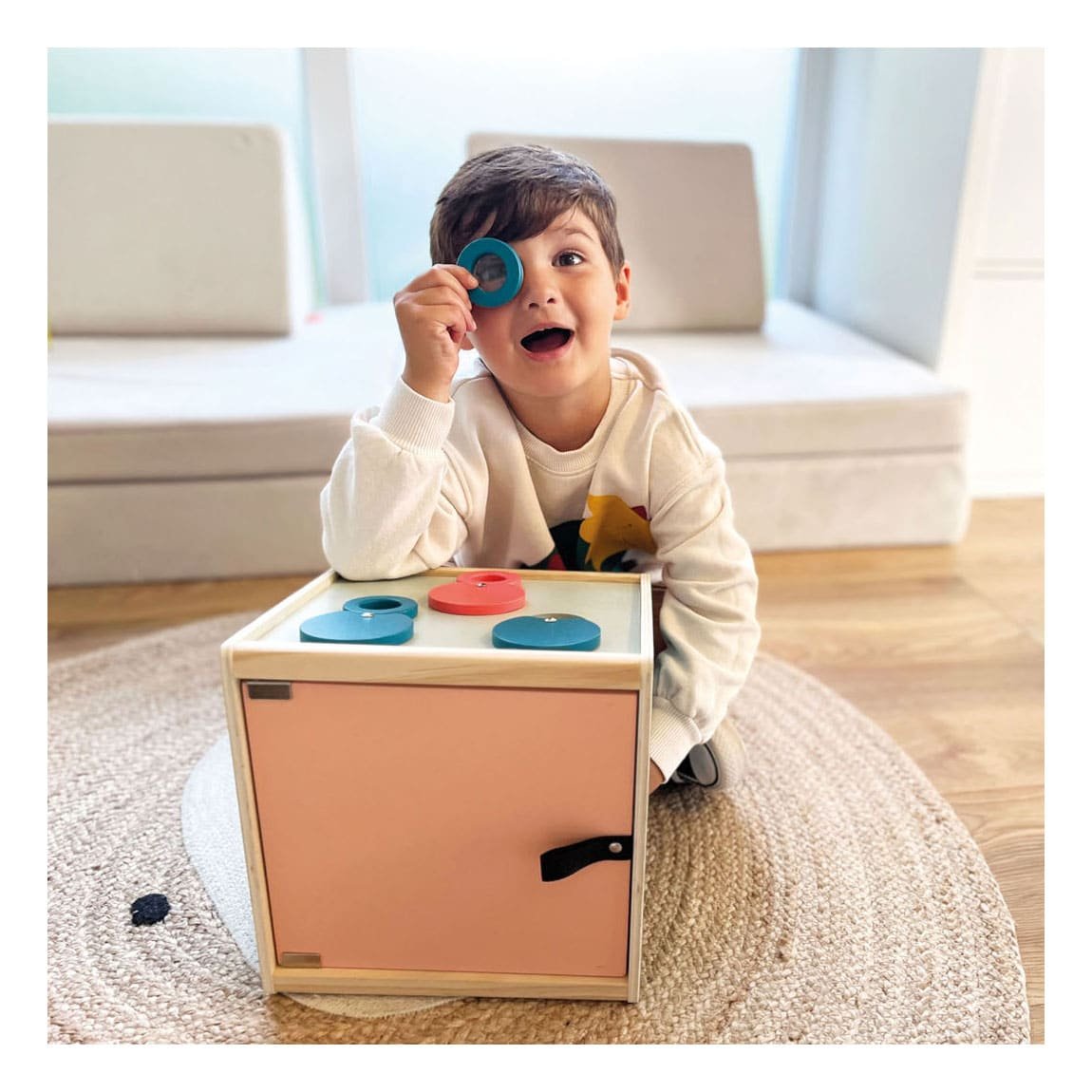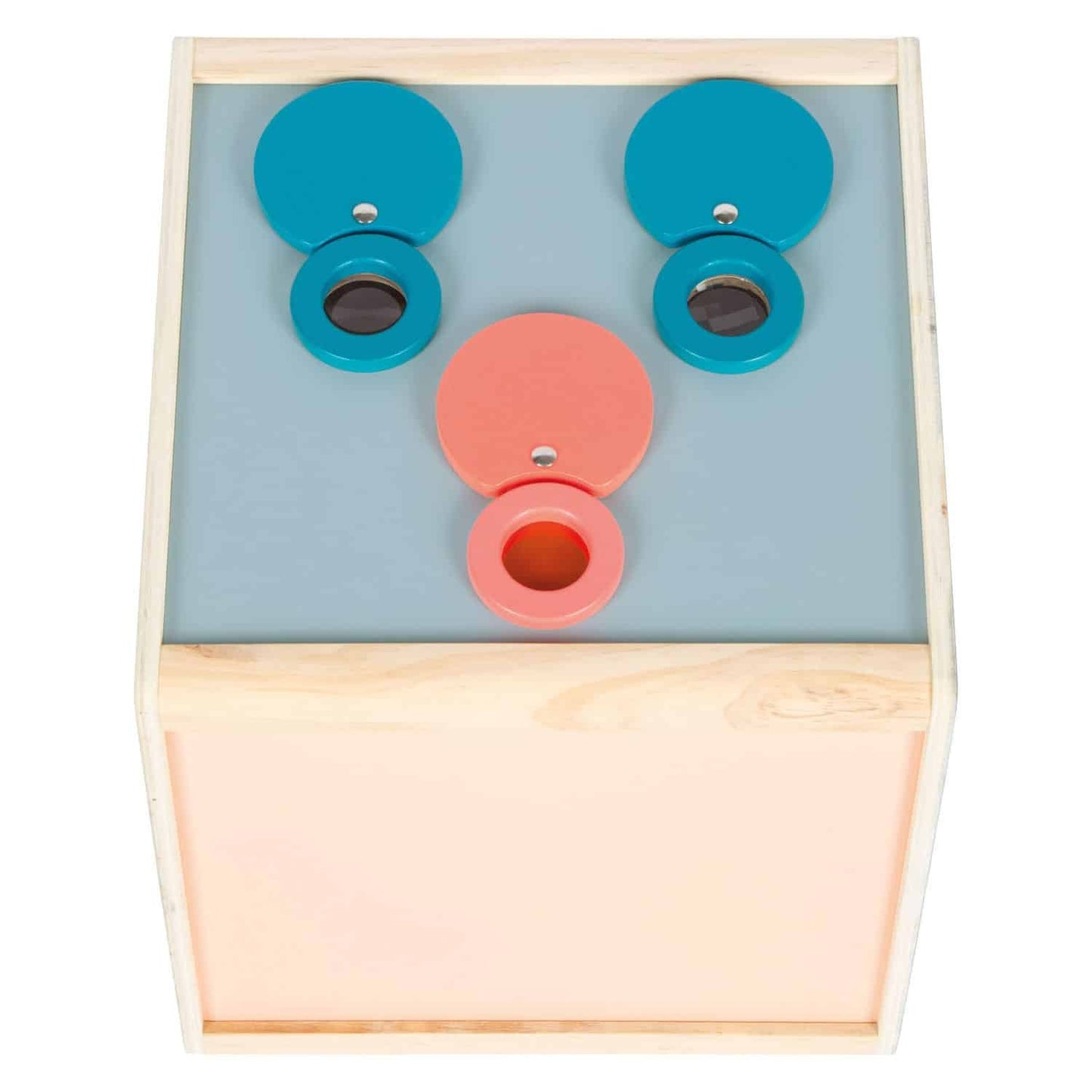 Scherp je zintuigen op een leuke manier! Deze royale sensorische velbox uit de productlijn "Sensory" heeft twee openingen aan de zijkant en biedt volop mogelijkheden om objecten te verkennen met behulp van aanraking, zicht, geur en gehoor. Met een vergrootglas, een caleidoscooplens en een rode lens kun je objecten in de doos op een nieuwe manier bekijken. Door de afgeschuinde bovenzijde van de doos is het gemakkelijk om er doorheen te kijken en voorwerpen aan te raken. De drie in hout omhulde lenzen kunnen eenvoudig worden verwijderd, waardoor de openingen aan de bovenkant van de doos kunnen worden gebruikt om te kijken, ruiken en luisteren. De hoeveelheid licht die de bak binnenkomt, kan worden geregeld via de openingshoek van de achterdeur en de bovenste vlinderopening.