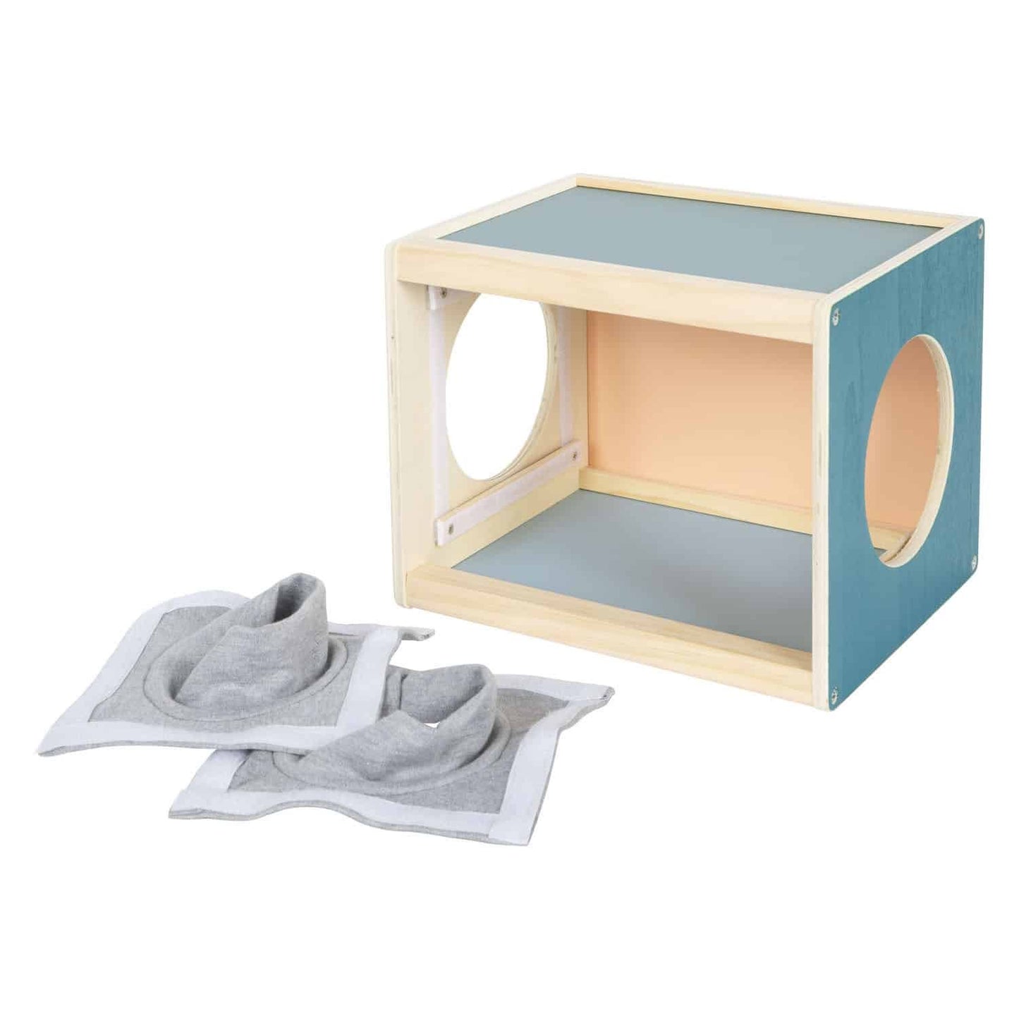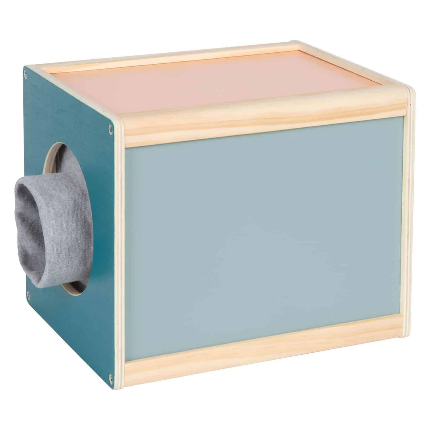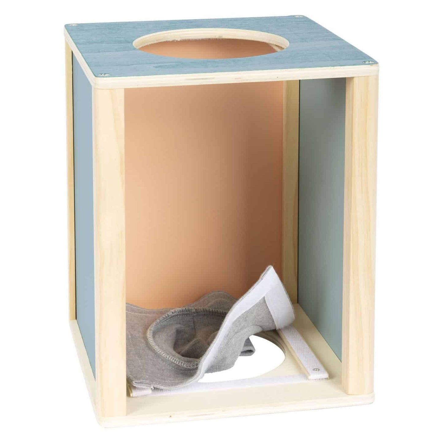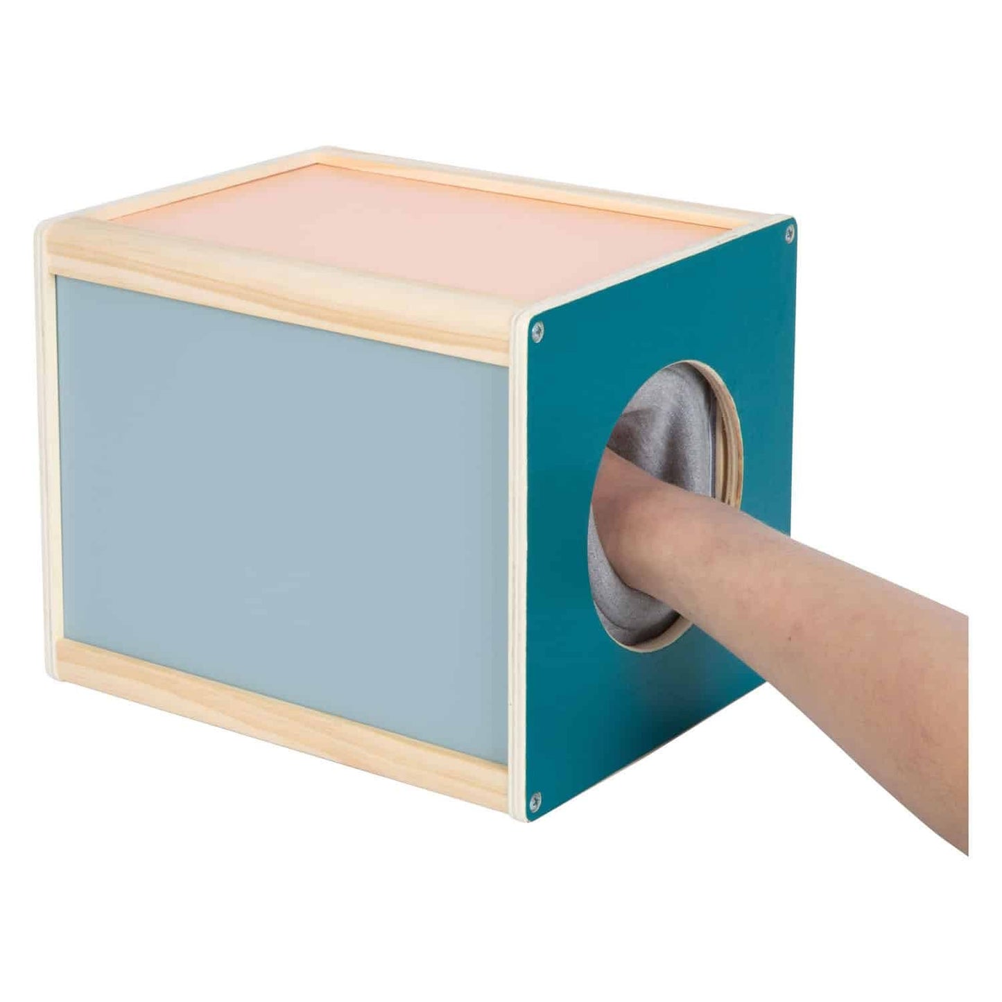 Via de achterdeur met magnetische sluiting kunnen voorwerpen in deze houten kist worden geplaatst. Hoezen van stof aan de zijopeningen blokkeren het zicht in de doos en bieden tegelijkertijd aangenaam gedempte openingen waar de handen doorheen kunnen grijpen. Dankzij de elastische stof kunnen de mouwen door zowel kinderen als ouders gebruikt worden. Het is een tactiel, visueel en reukzintuiglijk spel dat gokplezier biedt voor één of maximaal negen spelers. De mouwbanden zijn met klittenband vastgemaakt, waardoor ze afneembaar zijn en met de hand gewassen kunnen worden.