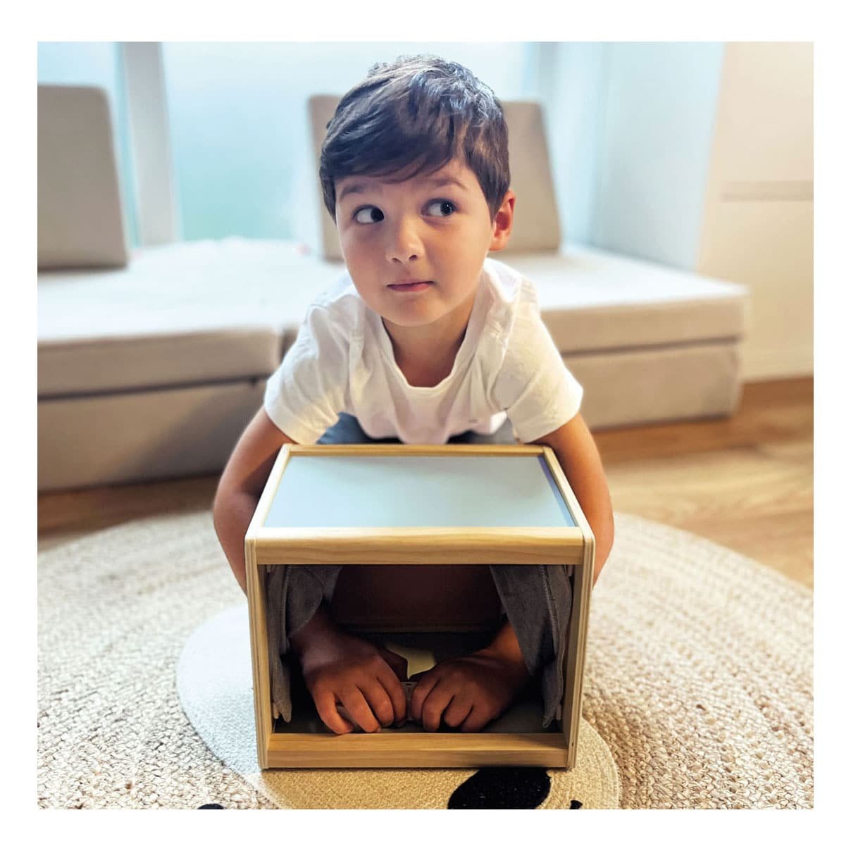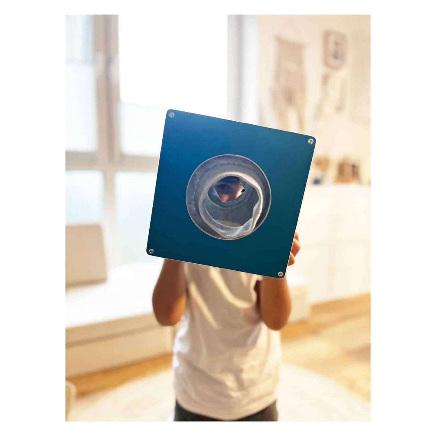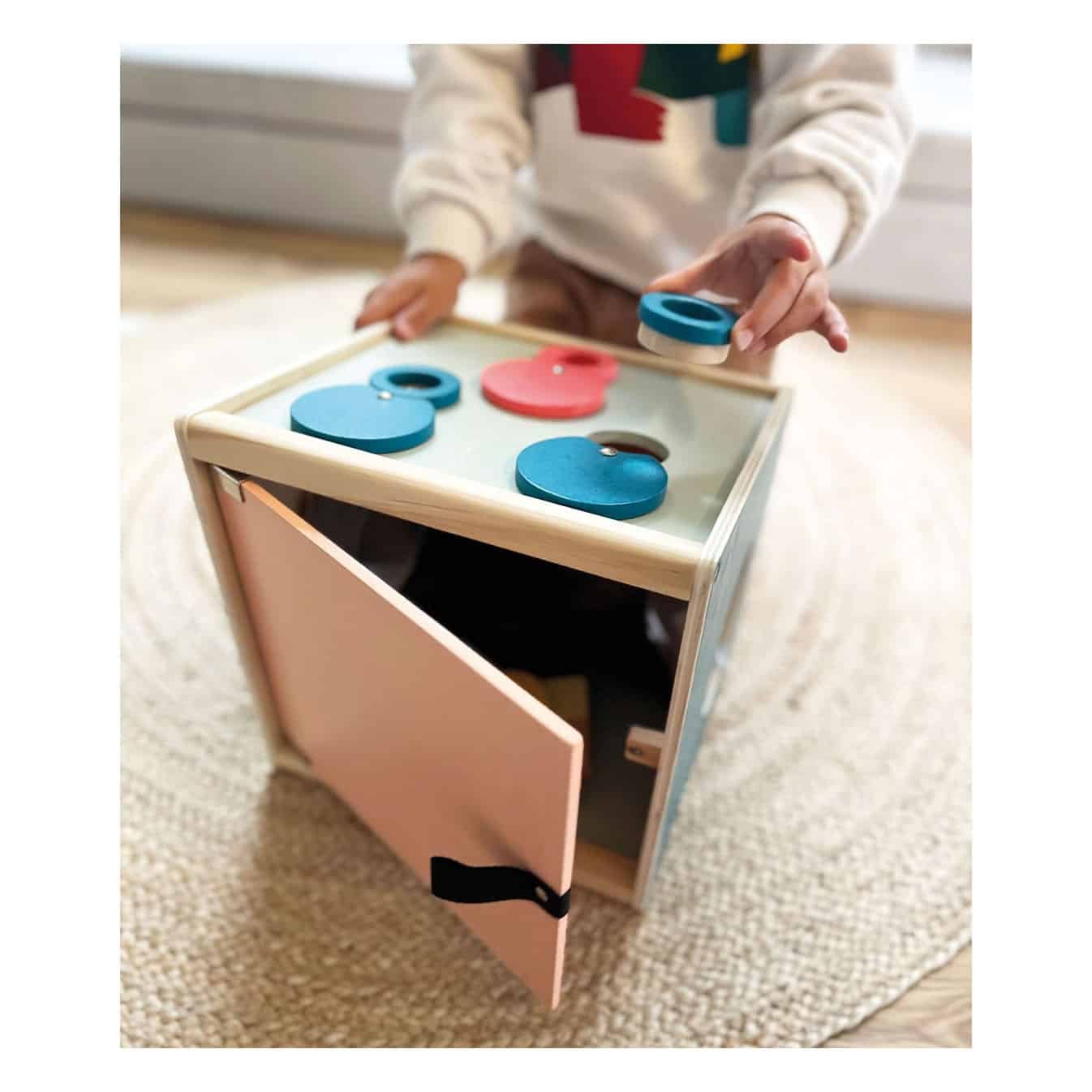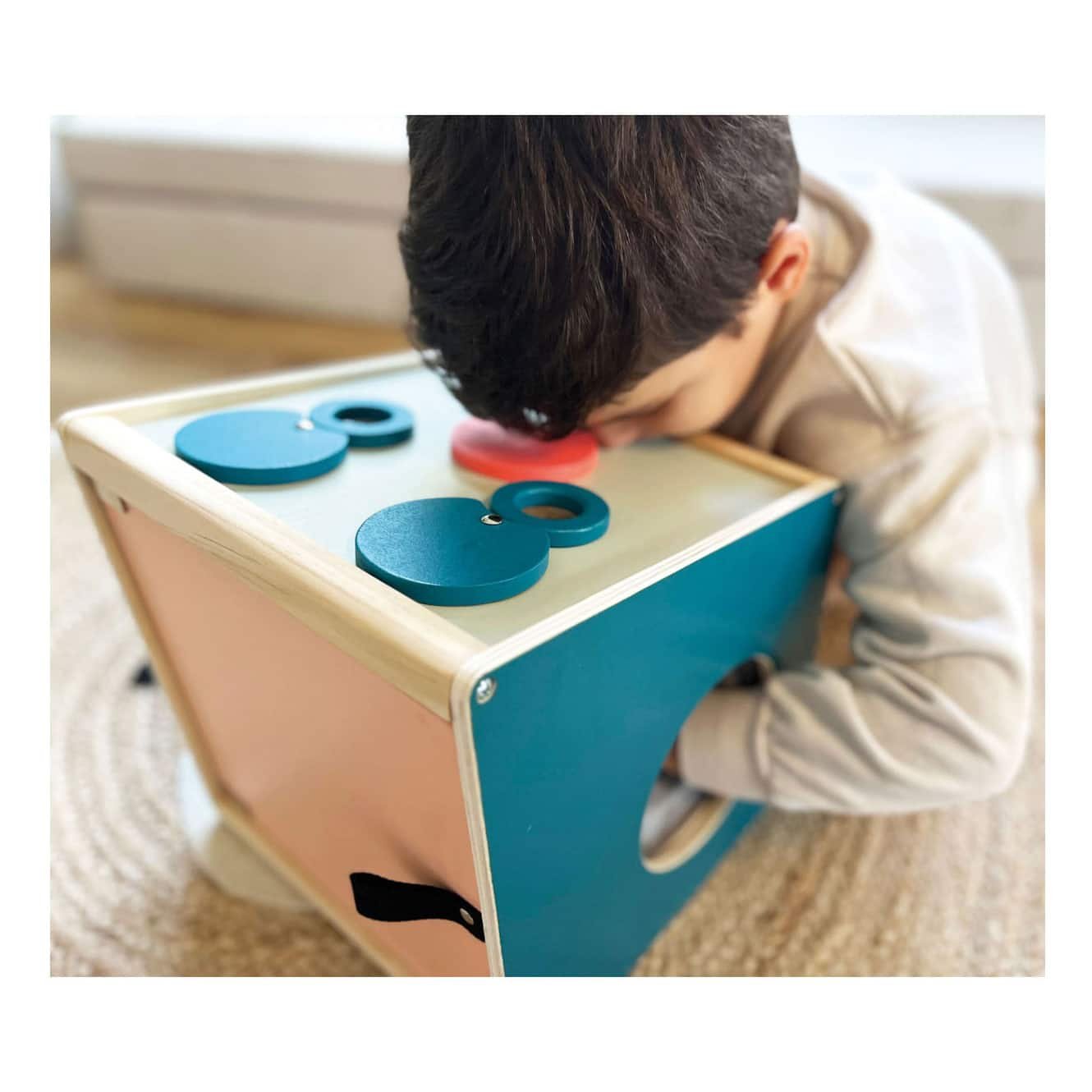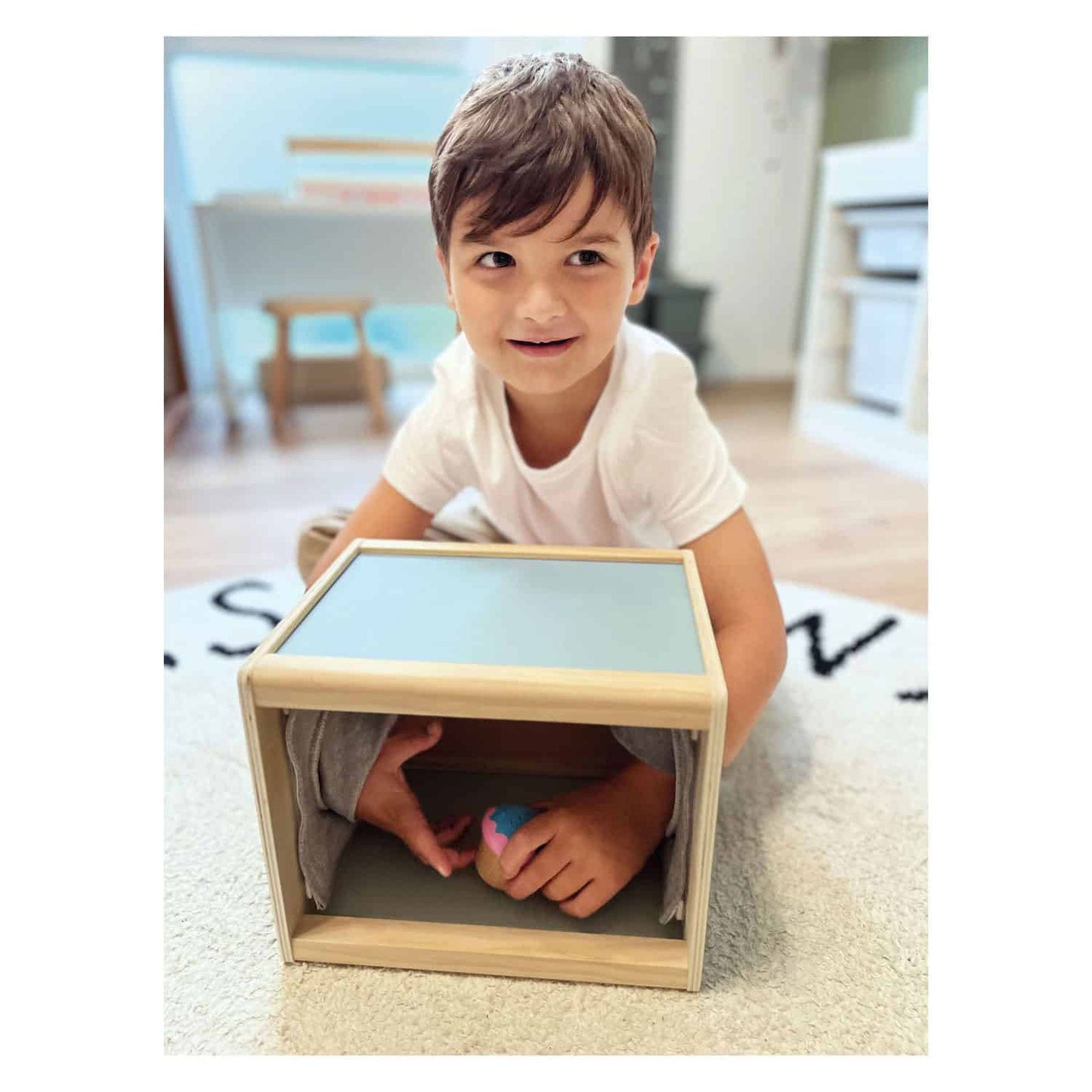 Via de achterdeur met magnetische sluiting kunnen voorwerpen in deze houten kist worden geplaatst. Hoezen van stof aan de zijopeningen blokkeren het zicht in de doos en bieden tegelijkertijd aangenaam gedempte openingen waar de handen doorheen kunnen grijpen. Dankzij de elastische stof kunnen de mouwen door zowel kinderen als ouders gebruikt worden. Het is een tactiel, visueel en reukzintuiglijk spel dat gokplezier biedt voor één of maximaal negen spelers. De mouwbanden zijn met klittenband vastgemaakt, waardoor ze afneembaar zijn en met de hand gewassen kunnen worden.