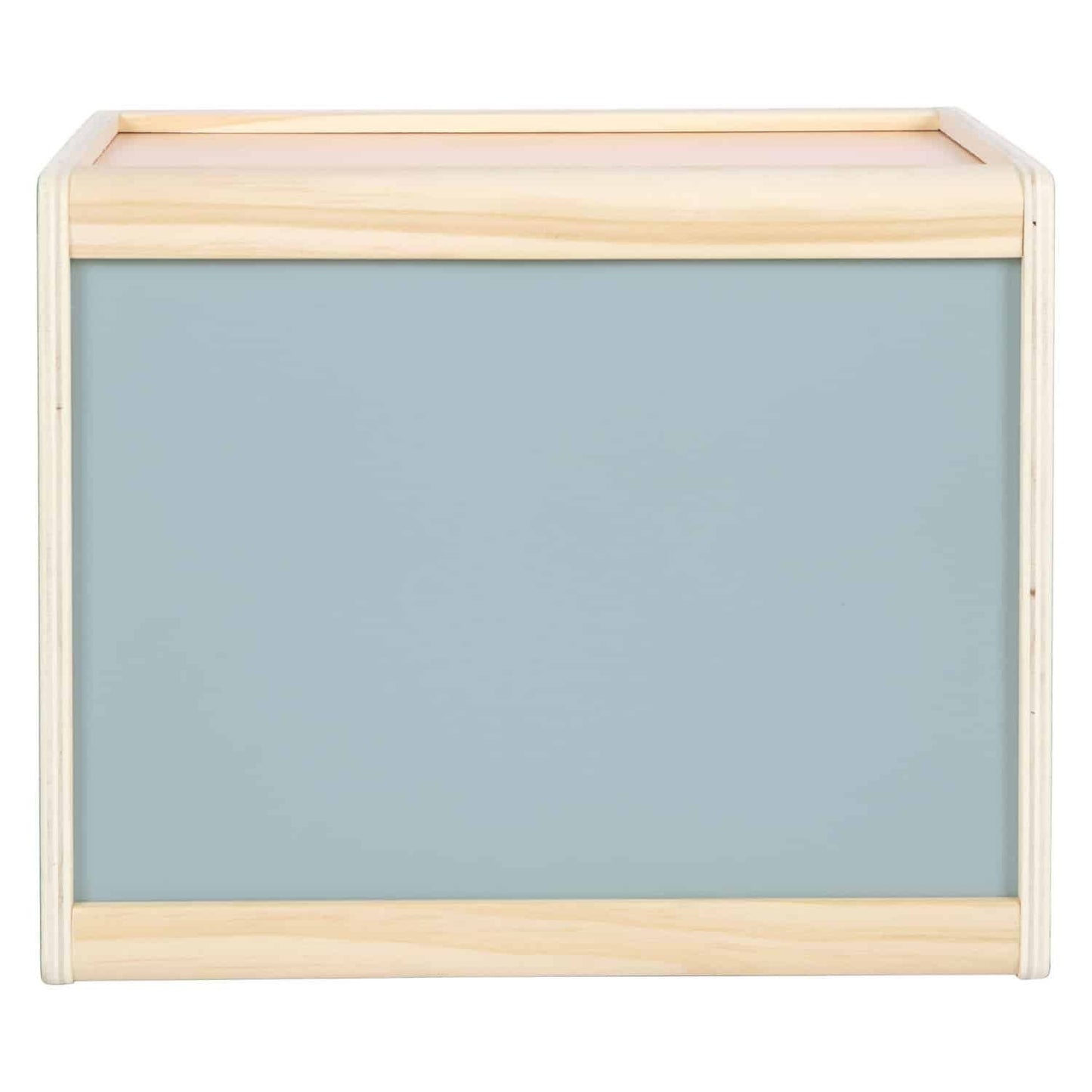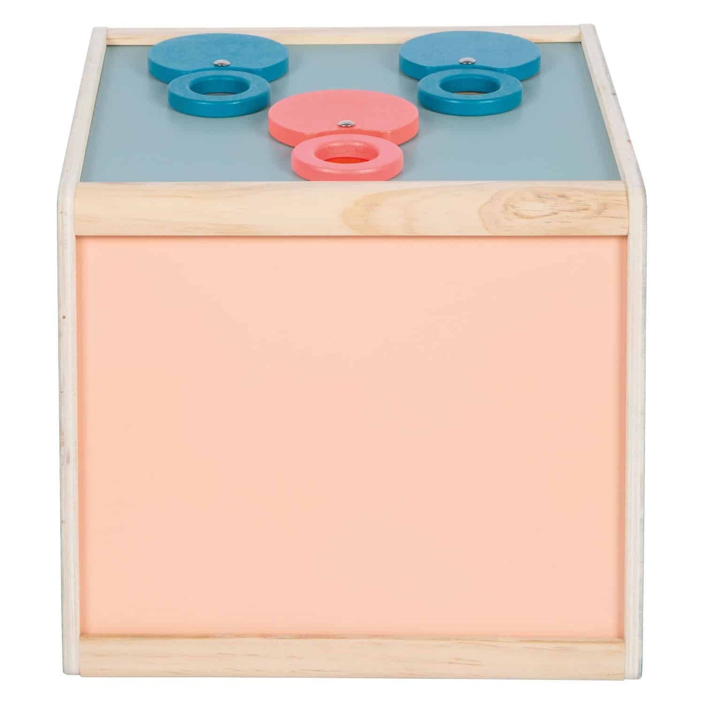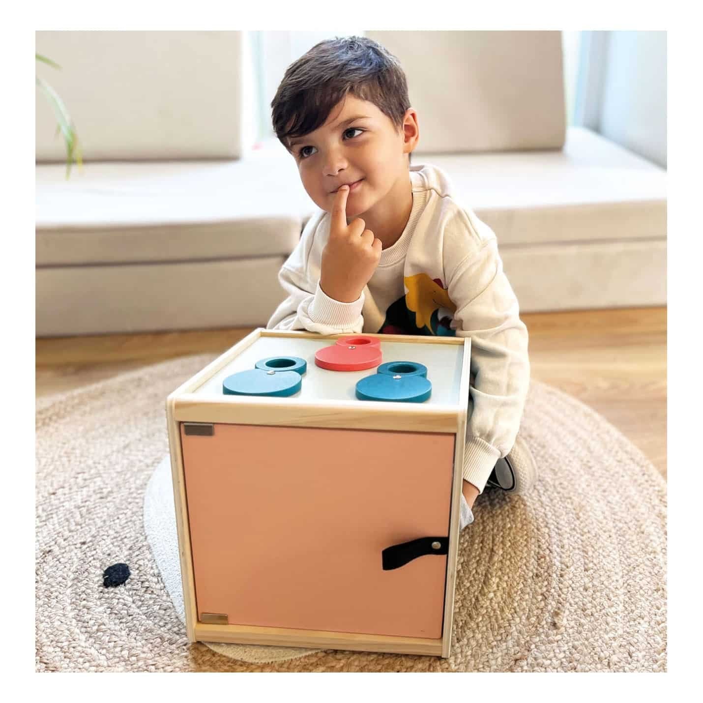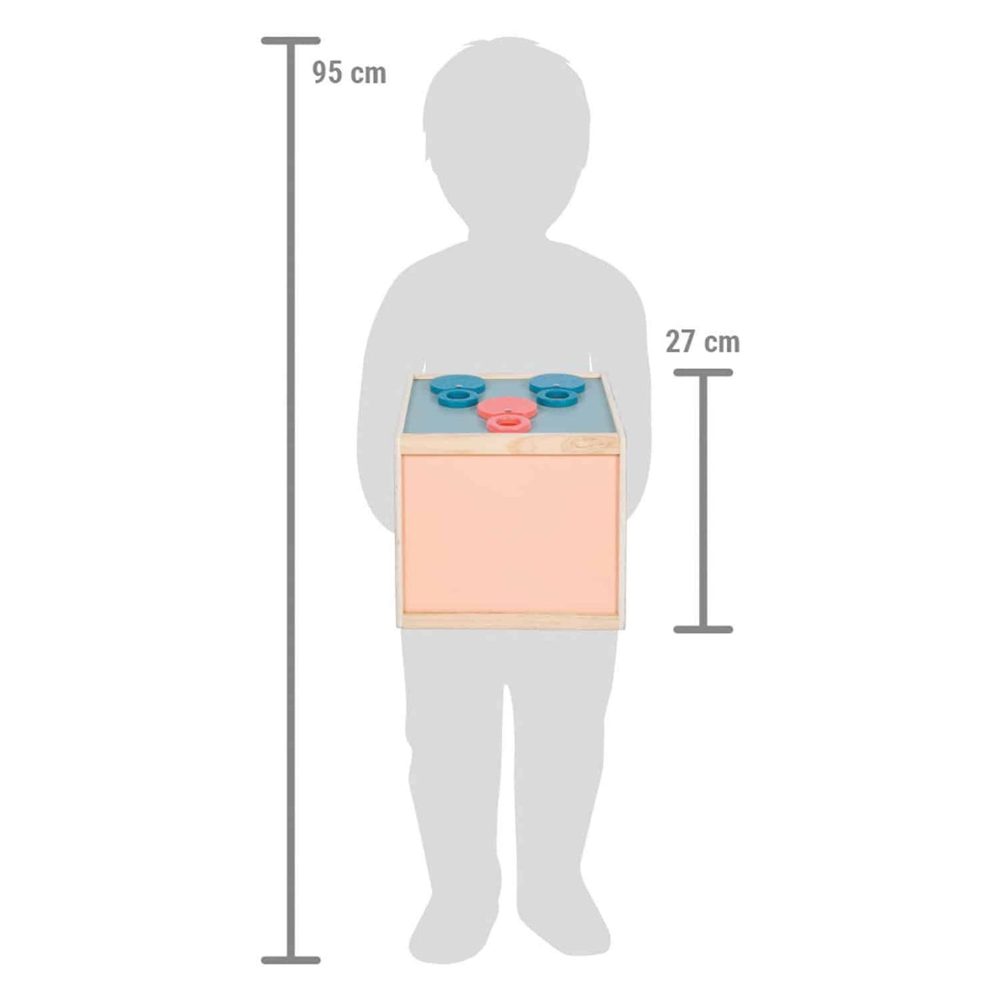 Via de achterdeur met magnetische sluiting kunnen voorwerpen in deze houten kist worden geplaatst. Hoezen van stof aan de zijopeningen blokkeren het zicht in de doos en bieden tegelijkertijd aangenaam gedempte openingen waar de handen doorheen kunnen grijpen. Dankzij de elastische stof kunnen de mouwen door zowel kinderen als ouders gebruikt worden. Het is een tactiel, visueel en reukzintuiglijk spel dat gokplezier biedt voor één of maximaal negen spelers. De mouwbanden zijn met klittenband vastgemaakt, waardoor ze afneembaar zijn en met de hand gewassen kunnen worden.